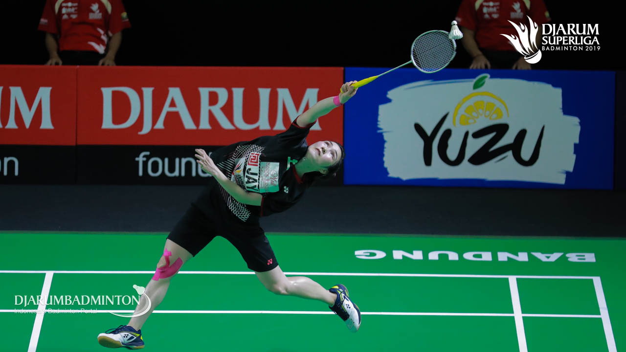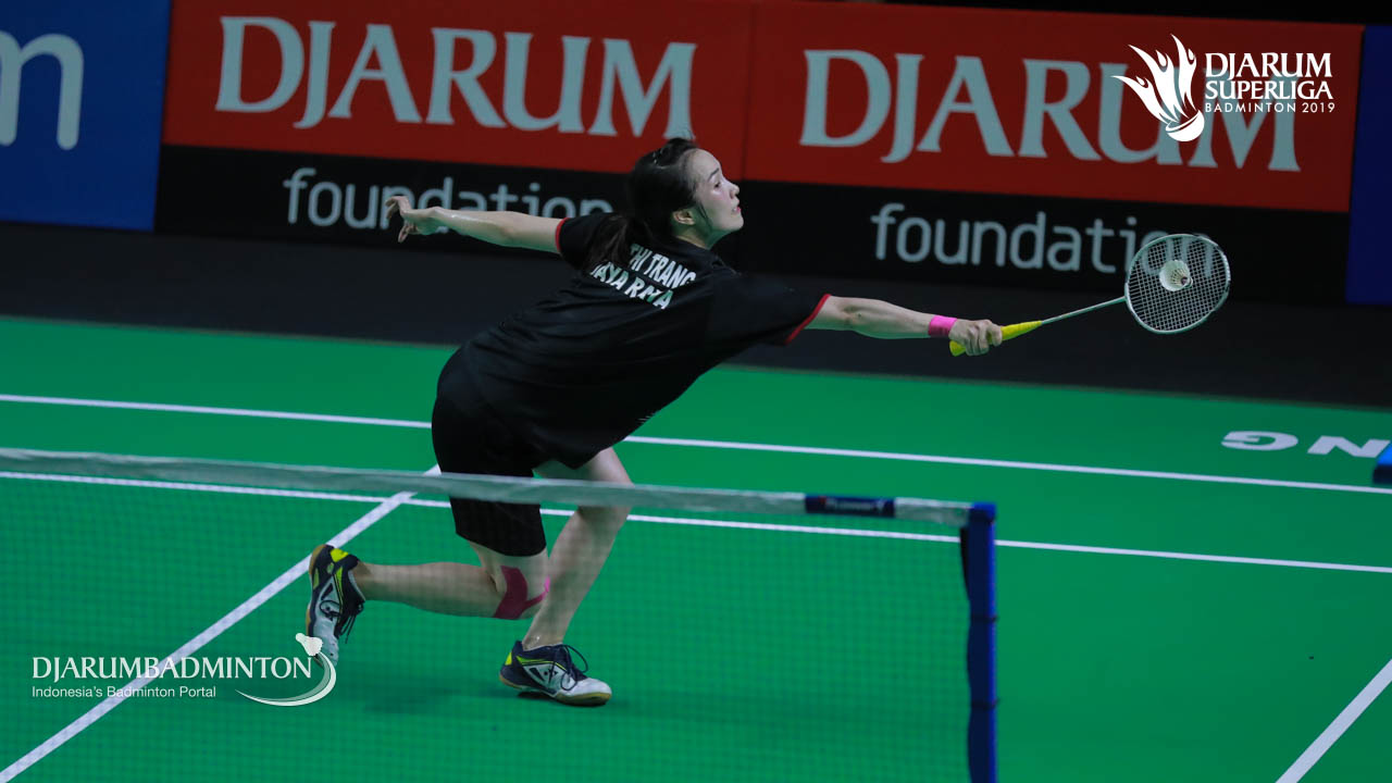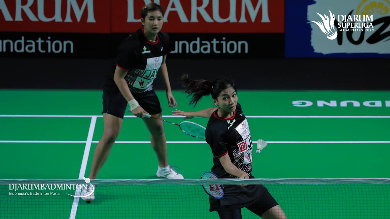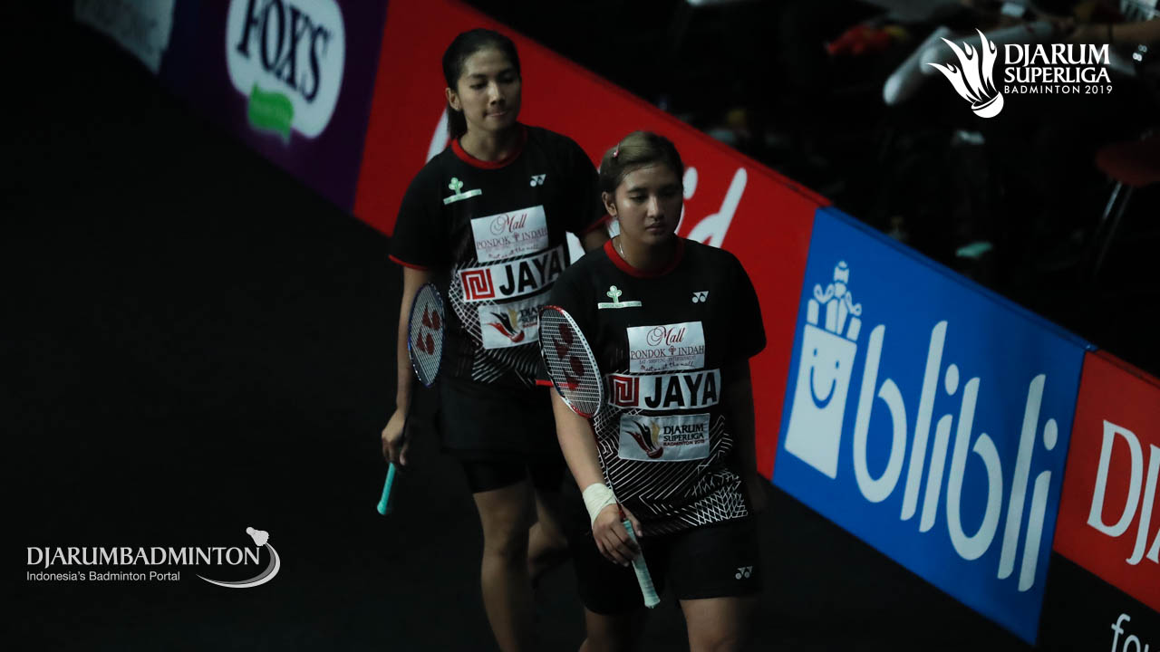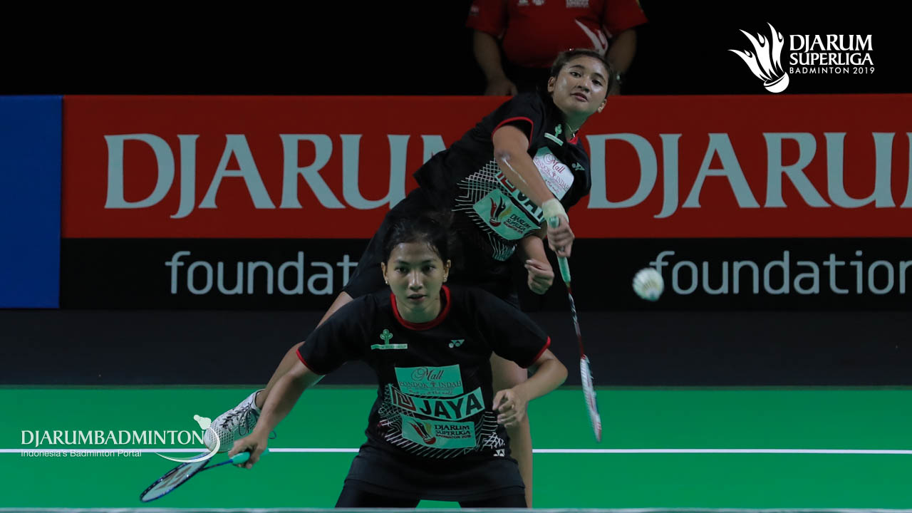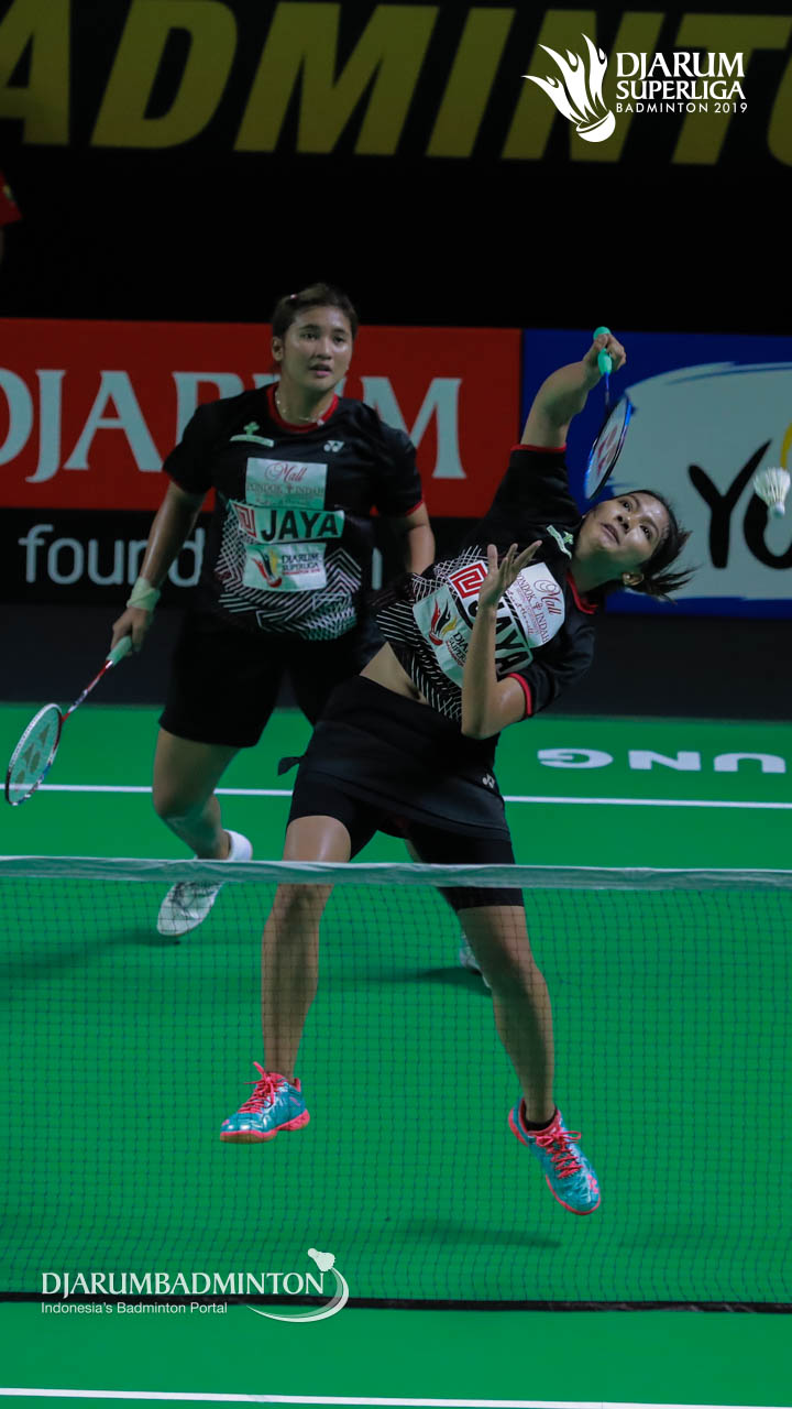 Jauza Fadhila Sugiarto/Virni Putri (Jaya Raya Jakarta) mengembalikan shuttlecock