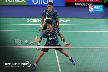 Muhammad Shohibul Fikri/Yeremia Erich Yoche (Indonesia) Bersiap Mengembalikan Shuttlecock