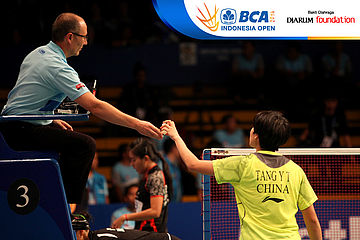 Tang Yuanting (China) meminta pergantian shuttlecock