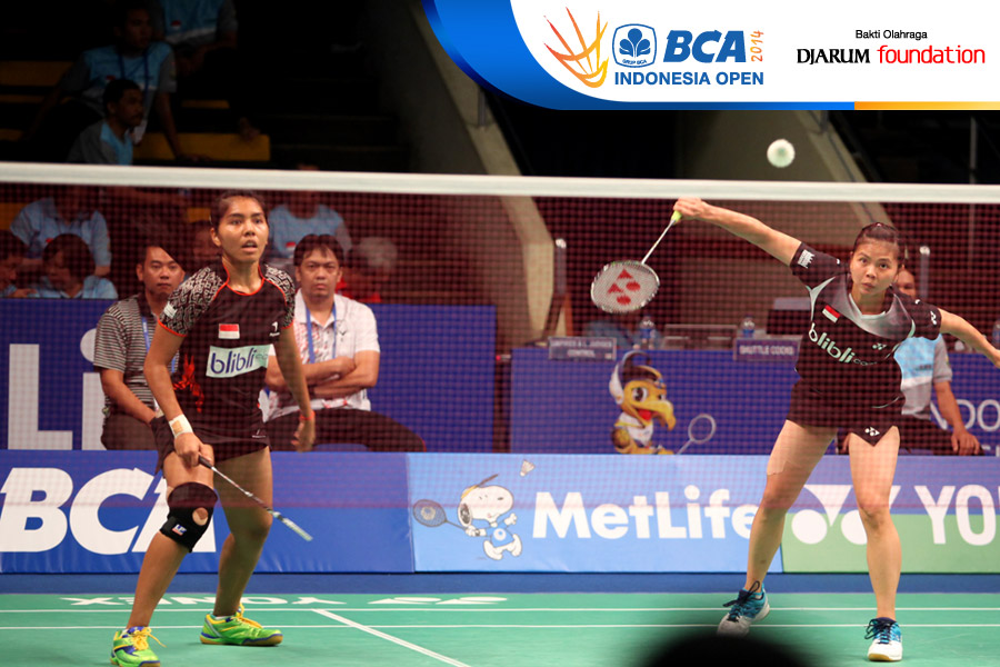Nitya Krishinda M/Greysia Polii (Indonesia) mengembalikan serve dari pasangan Ma Jin/Tang Yuanting (China)