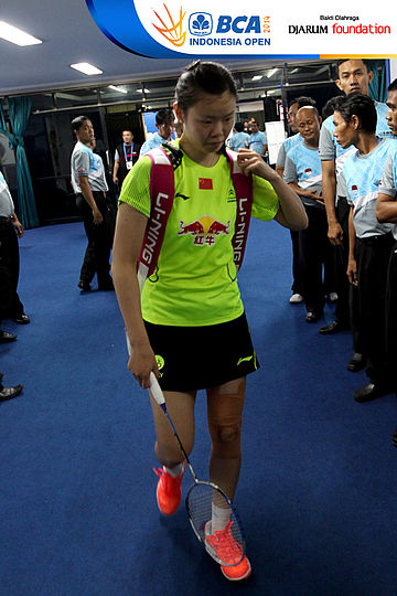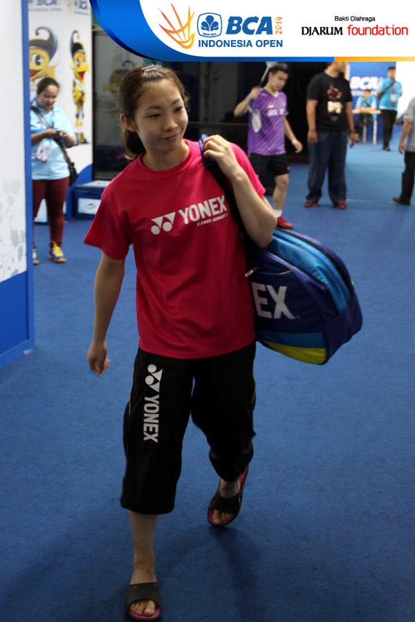 Li Xuerui (China) bersiap memasuki lapangan pertandingan