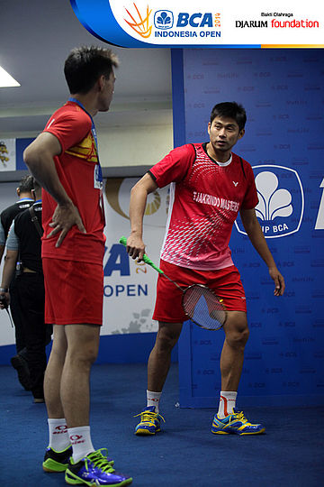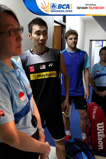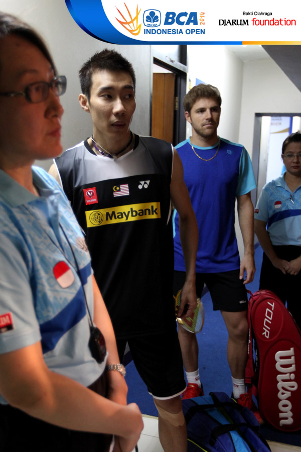 Lee Chong Wei (Malaysia) dan Brice Leverdez (Perancis) bersiap memasuki lapangan pertandingan