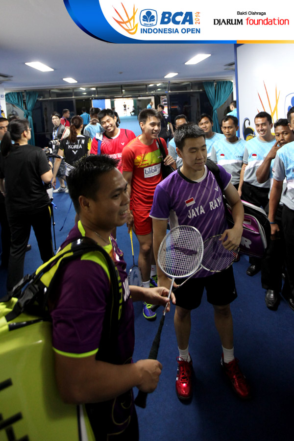 Gideon Markus F/Markis Kido (Indonesia) dan Rendra Wijaya/Rian Sukmawan (Indonesia) bersiap memasuki lapangan pertandingan