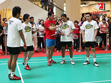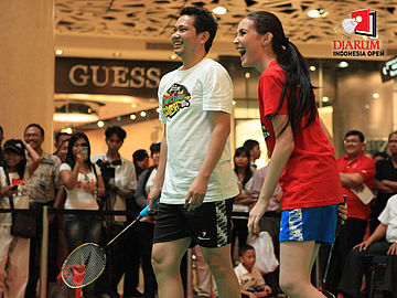 Ekspresi Denny Sumargo usai berhasil memasukan kok.