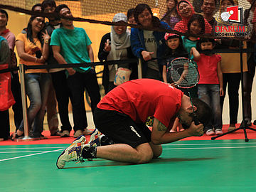 Ekspresi Gading Marten saat gagal memukul kok.
