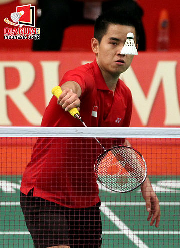 Pemain Indonesia, Simon Santoso berusaha mengembalikan kok ke arah pemain Hong Kong, Wong Wing Ki.