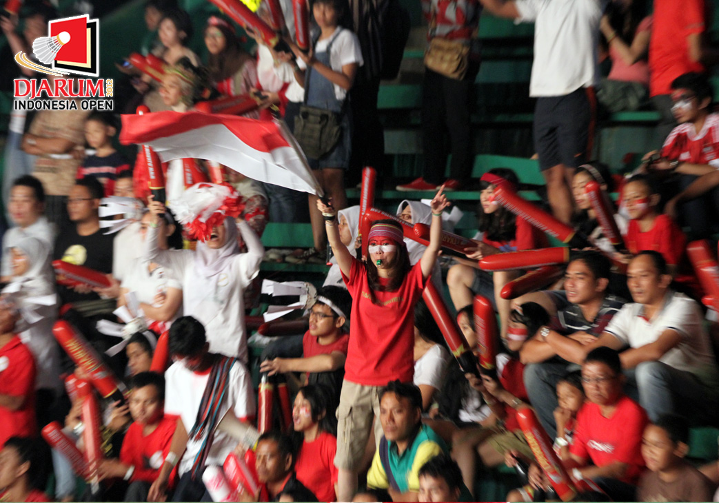 Aksi suporter Indonesia kala mendukung Indonesia di ronde kedua Djarum Indonesia Open 2012.