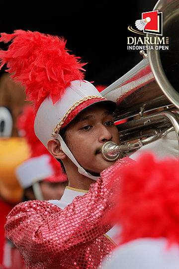 Penampilan marching band di depan Celebrity Bazaar cukup menarik perhatian sejumlah pengunjung yang hadir di Istora Senayan.