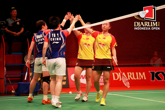 Wang Xiaoli/Yu Yang (China) bersalaman dengan Ma Jin/Yang Jinhua (China) usai bertanding.