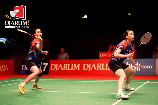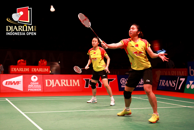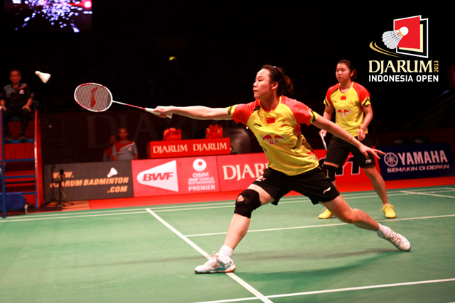 Bao Xiyin/Cheng Shu (China) bersiap mengembalikan shuttlecock ke arah pasangan Tian Qing/Zhao Yunlei (China).