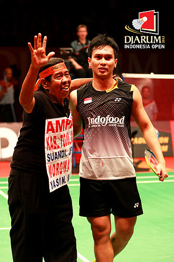 Mohammad Ahsan (kanan) mendapatkan apresiasi dari salah satu pengunjung yang nekat masuk ke lapangan pertandingan.