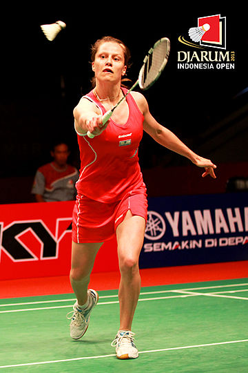 Juliane Schenk (Jerman) mengembalikan shuttlecock ke arah Saina Nehwal (India).