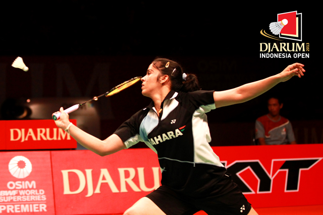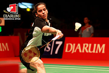 Saina Nehwal (India) mengembalikan shuttlecock ke arah Juliane Schenk (Jerman).