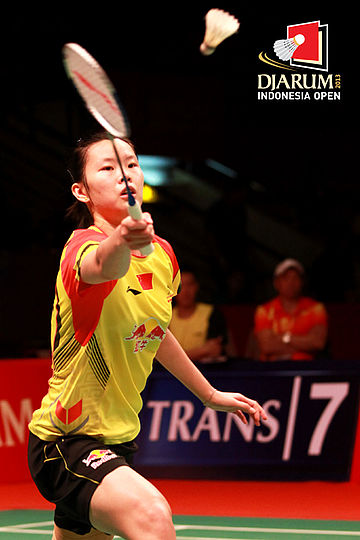 Yip Pui Yin (Hongkong) mengembalikan shuttlecock ke arah Li Xuerui (China).