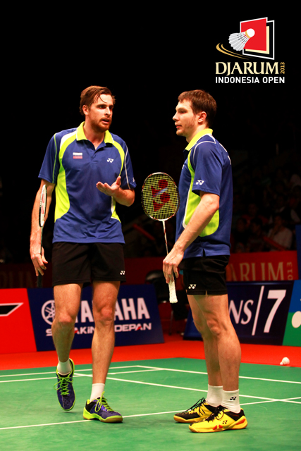Vladimir Ivanov/Ivan Sozonov (Rusia) saling berkomunikasi untuk menyusun serangan.