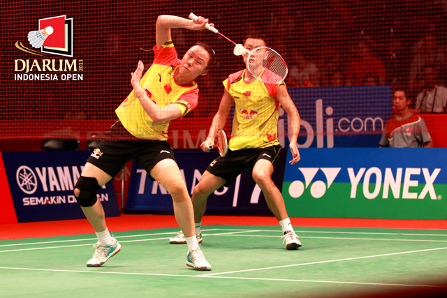 Xu Chen/Ma Jin (China) bersiap mengembalikan shuttlecock ke arah Zhang Nan/Zhao Yunlei (China).