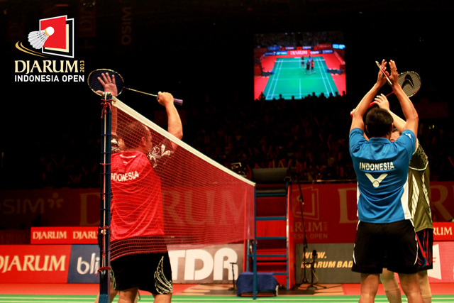 Haryanto Arbi, Sigit Budiarto, Eddy Hartono dan Trikus Harjanto memberikan kepada seluruh pengunjung yang memadati Istora Senayan usai menyelesaikan pertandingan "Badmin-Punk".