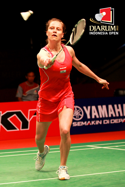 Juliane Schenk (Jerman) bersiap melepaskan smash ke arah Saina Nehwal (India).