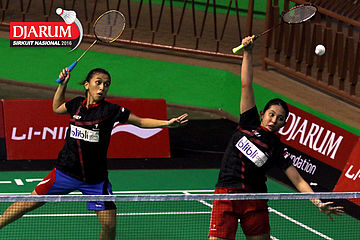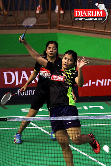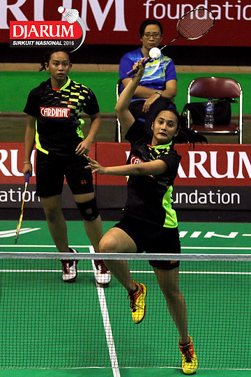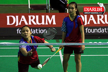 Dian Fitriani/Nadya Melati (Pertamina Fastron) mengembalikan shuttlecock