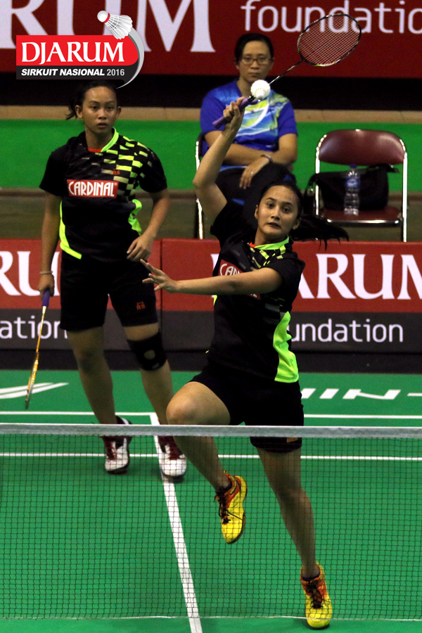 Dianita Saraswati/Monika Insany (Mutiara Cardinal) mengembalikan shuttlecock
