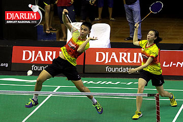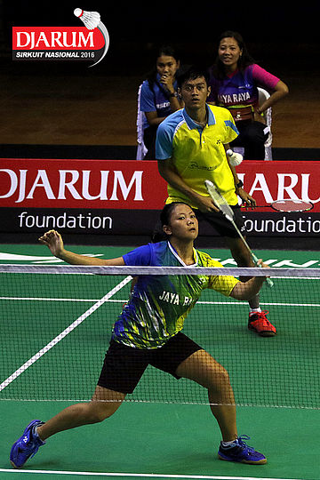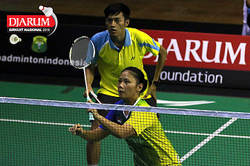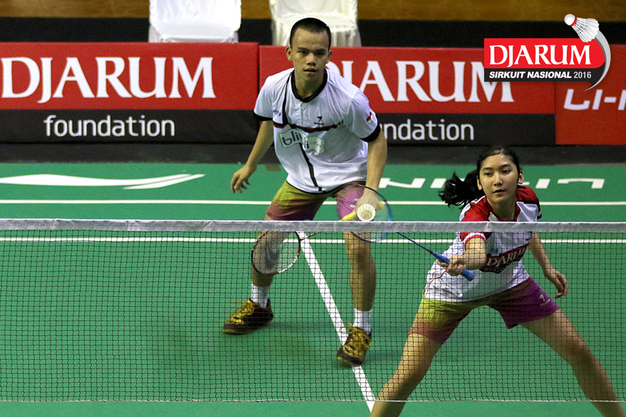 Rian Cana Varo/Shelandry Vyola (Djarum Kudus) bersiap menyambar pengembalian tanggung
