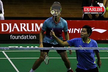Viorel Joan/Febby Valencia (Djarum Kudus) menghadang serangan