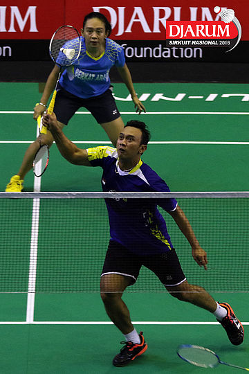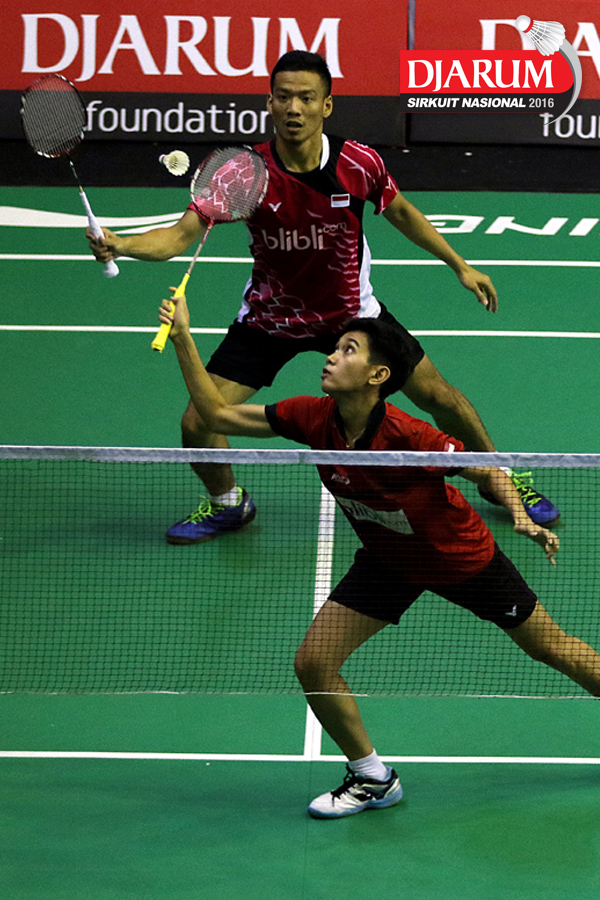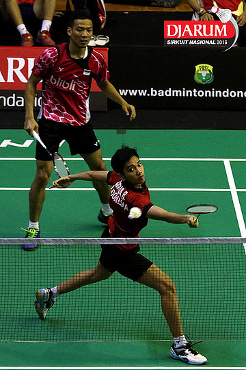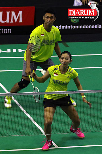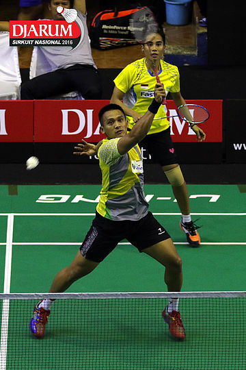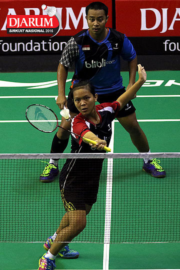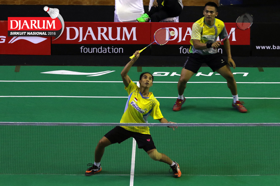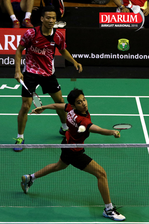 Trikusuma Wardhana/Keshya Nurvita Hanadia (Exist/Berkat Abadi) bersiap menyambar pengembalian tanggung