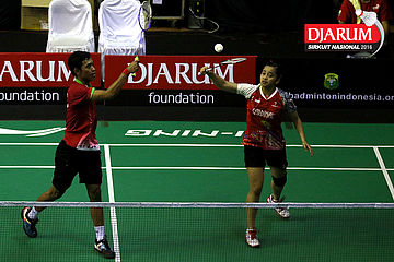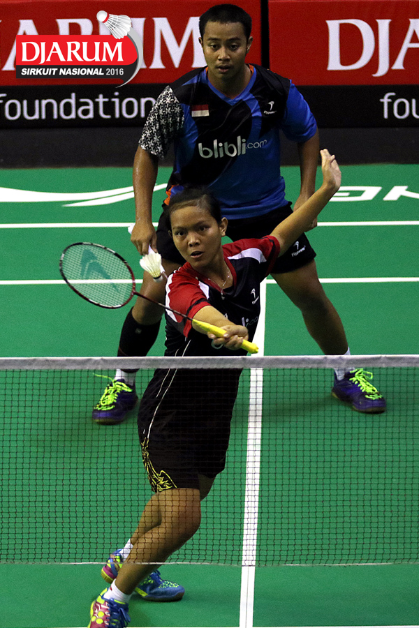Lukhi Apri/Ririn Amelia (Djarum Kudus) bersiap menyambar pengembalian