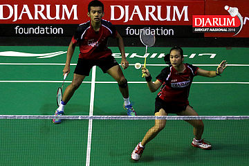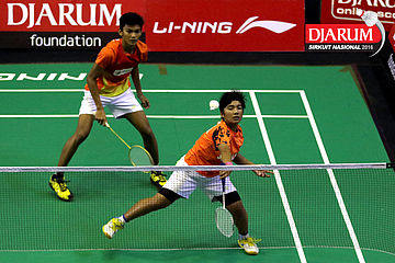 M. Shohibul/Intan Tri (Pusdiklat Telkom) mengembalikan shuttlecock