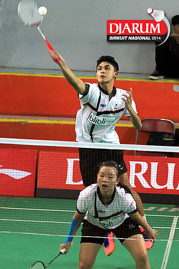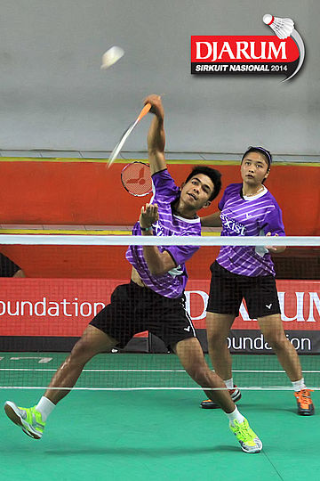 Jeka Wiratama/Marsheilla Gischa (Djarum Kudus) bersiap menyambar pengembalian dari Anbiya Bramasta/Anggelica Caroline (Mutiara Cardinal)