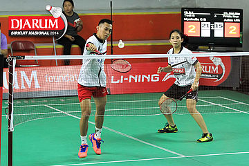 Stefan Indra/Nadya Melati (Mutiara Cardinal/Pertamina Fastron) berusaha menyambut pengembalian dari Didit Juang/Deariska Putri (Djarum Kudus)