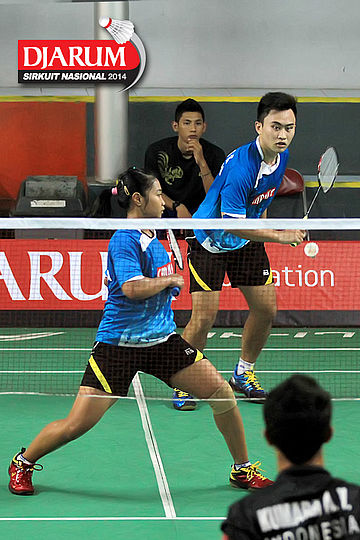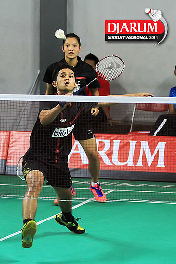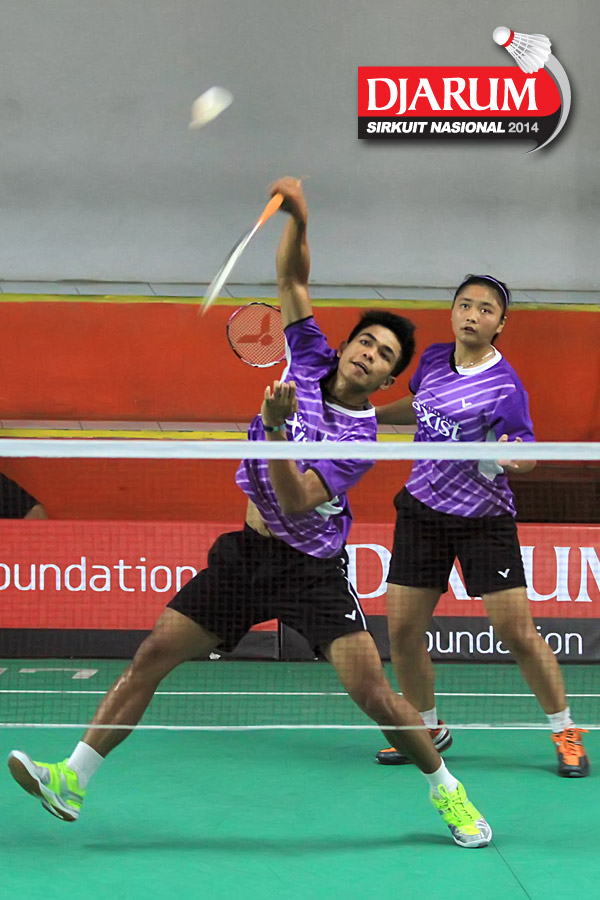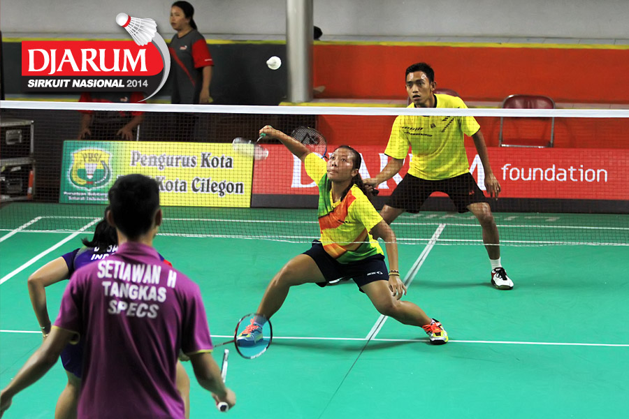 Ridho Akbar/Ery Octaviani (Halim/Jaya Raya) berhasil menghadang serangan yang dilepaskan pasangan Hidayat Setiawan/Desaula Gendy (Tangkas/Jaya Raya)