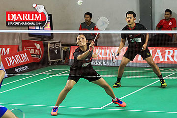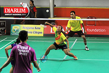 Ryan Sauqi/Jovita Evania (Mutiara Cardinal) gagal mengembalikan shuttlecock ke arah Arya Maulana/Della Augustia (Djarum Kudus)