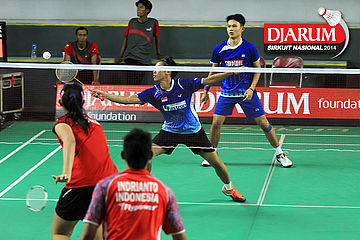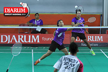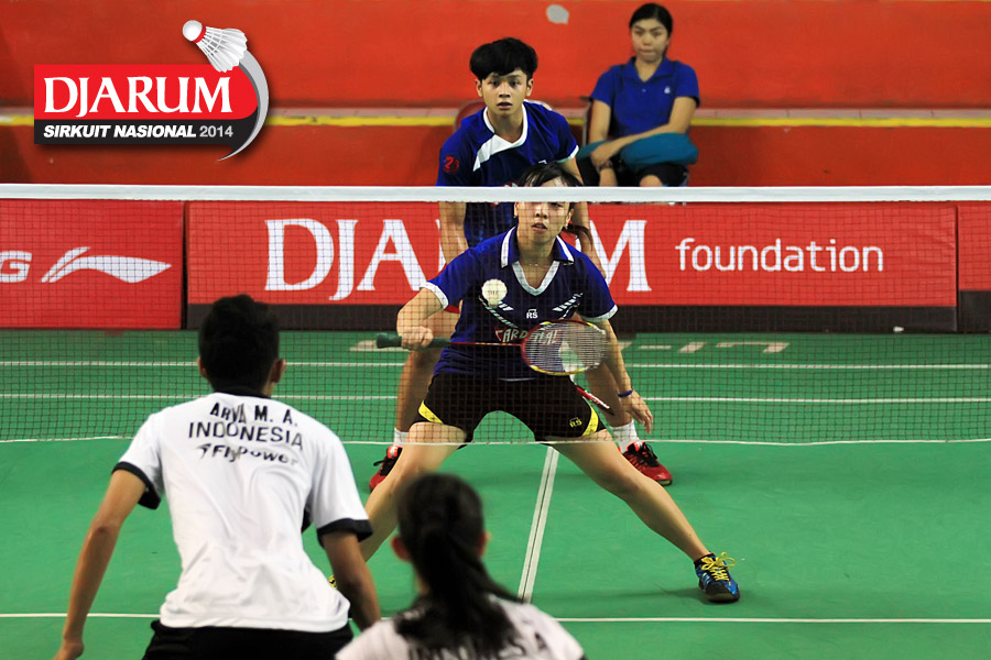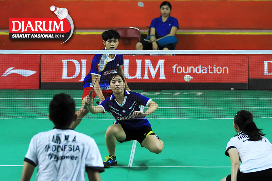 Tedi Supriadi/Mychelle Crhystine (Djarum Kudus) mengembalikan shuttlecock ke arah Frida Nur/Aziza Ulfa (Jaya Raya Azzikra/Jaya Raya)