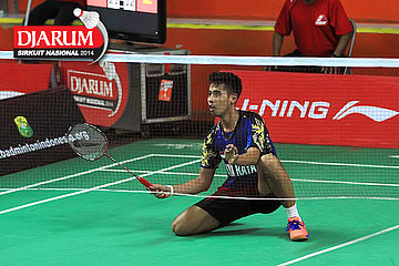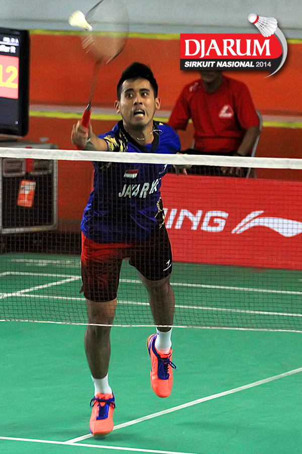 Hermansyah (Jaya Raya) menyambar pengembalian tanggung dari Kho Henrikho (Djarum Kudus)