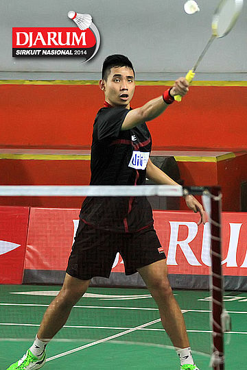 Kho Henrikho (Djarum Kudus) berhasil menghadang serangan yang dilepaskan Hermansyah (Jaya Raya)