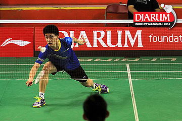 Hermansyah (Jaya Raya) bersiap menghadang serangan dari Kho Henrikho (Djarum Kudus)
