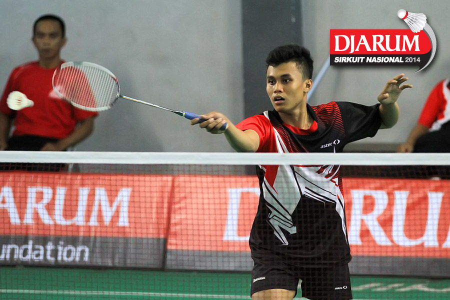Panji Akbar (Pelatprov PBSI DKI Jakarta) mengembalikan shuttlecock ke arah Senatria Agus (SGS PLN)