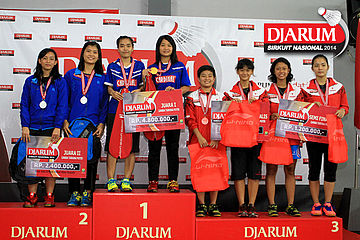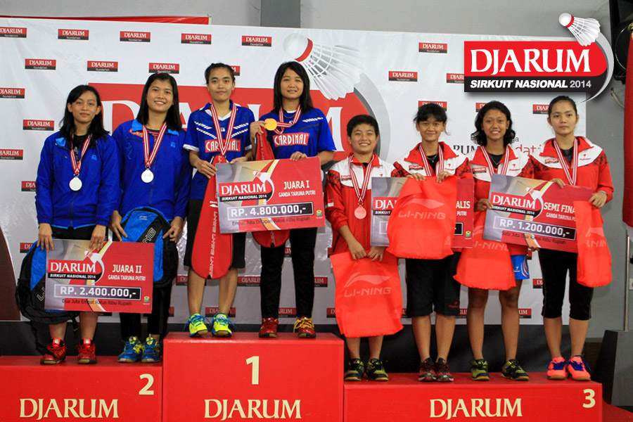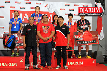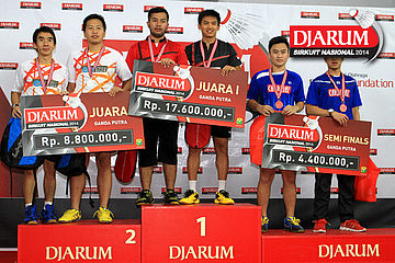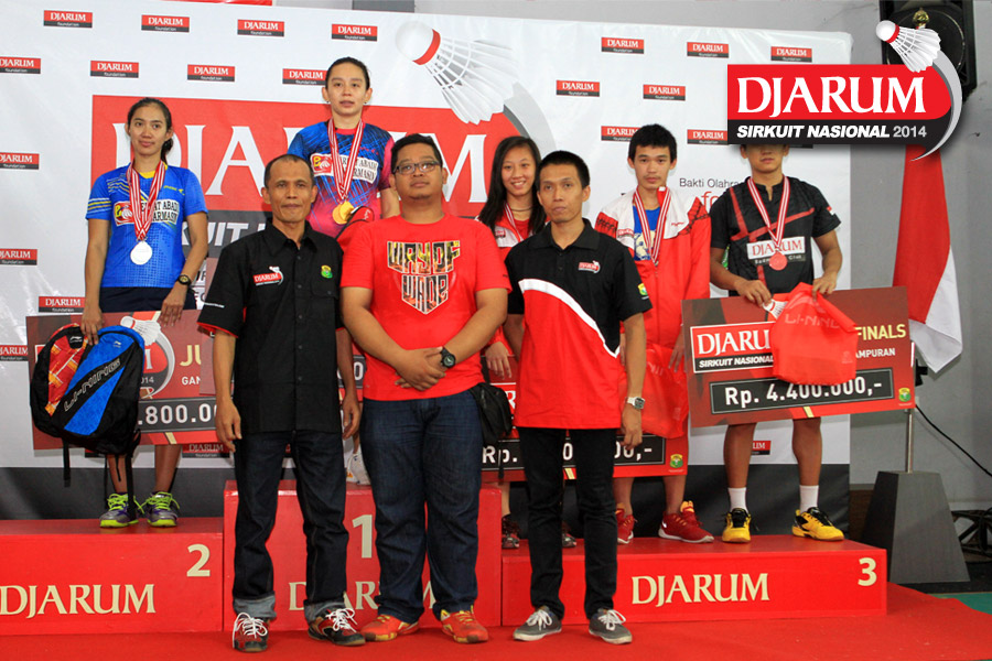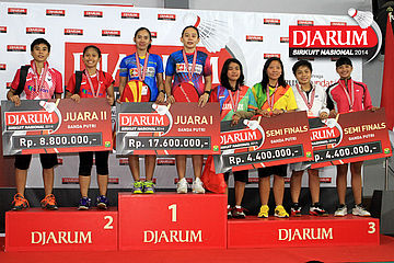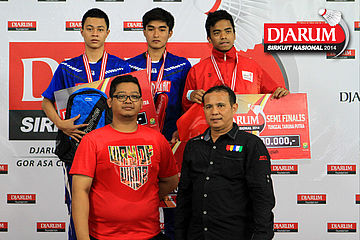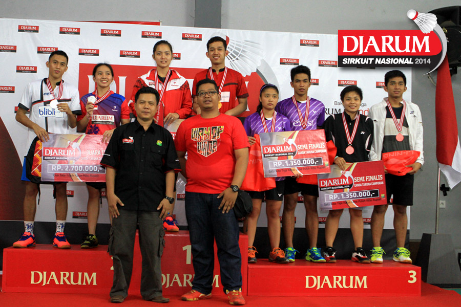 Tim Exist Jakarta berpose bersama usai pembagian hadiah juara Djarum Sirkuit Nasional Li-Ning Banten Open 2014