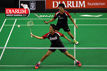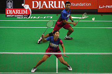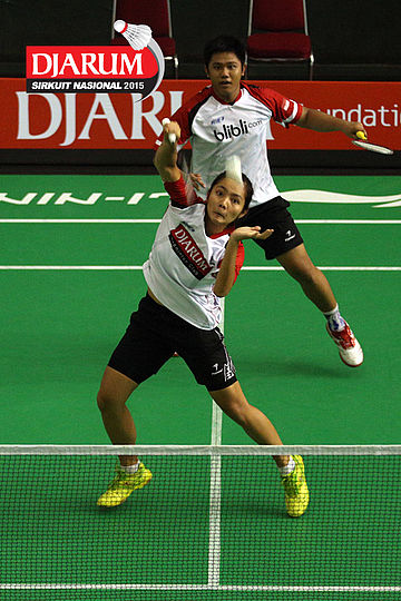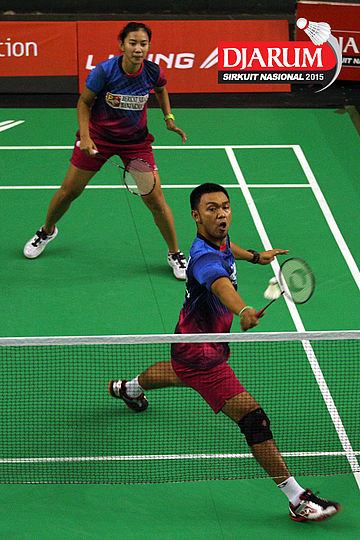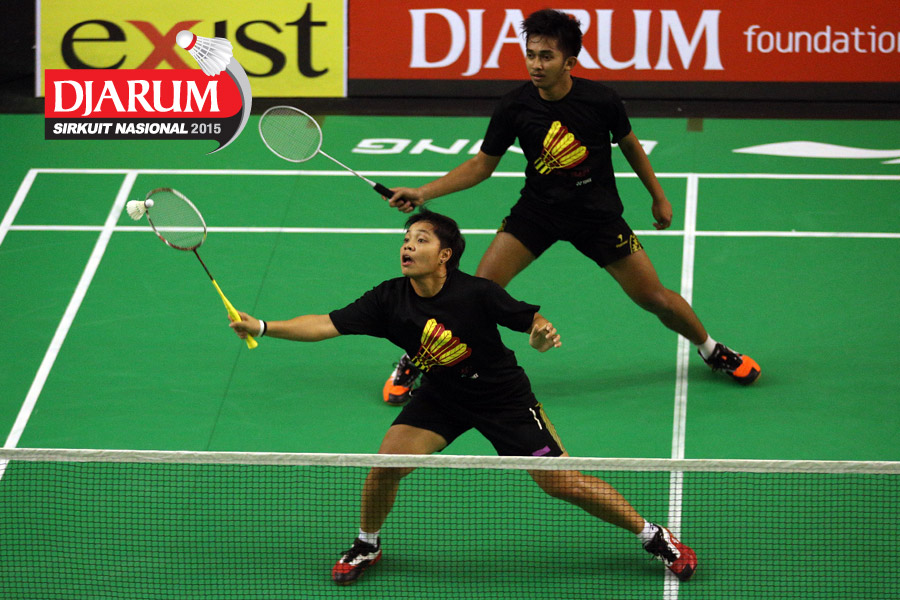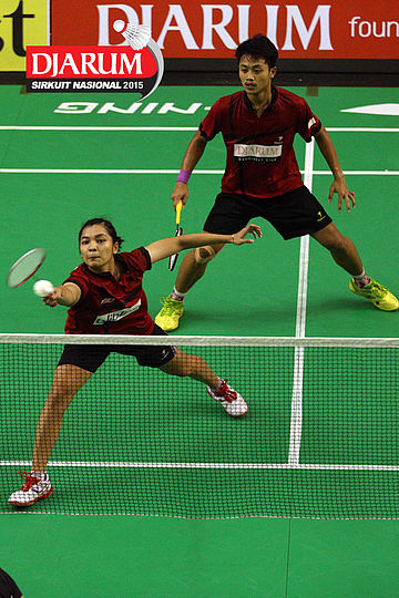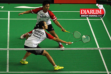 Akbar Bintang/Ristya Ayu (Djarum Kudus) menyambar pengembalian dari Fran Kurniawan/Komala Dewi (Djarum Kudus).