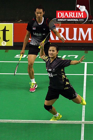 Yantoni Edy/Marsheilla Gischa (Djarum Kudus) menyambar pengembalian dari Rinov Rivaldy/Vania Arianti (Djarum Kudus).