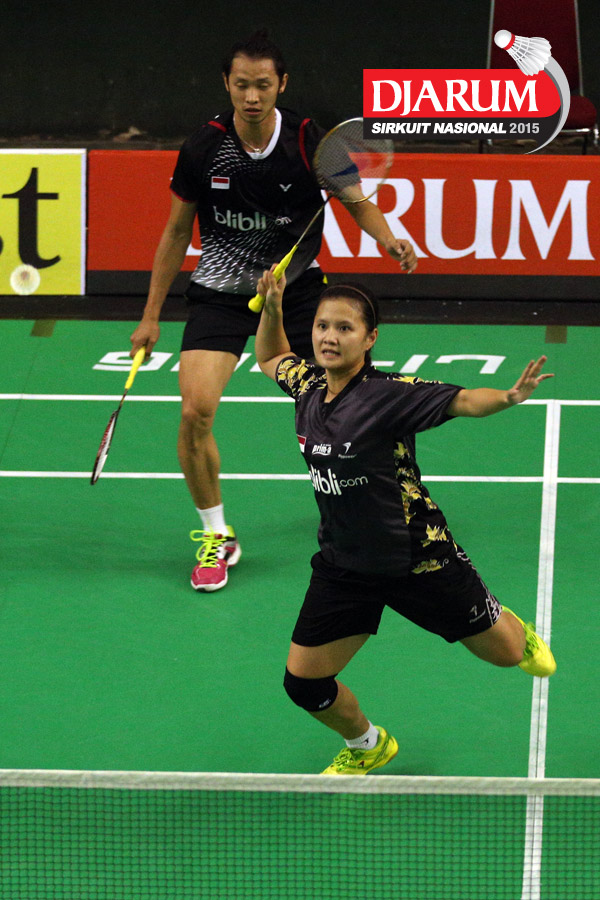 Yantoni Edy/Marsheilla Gischa (Djarum Kudus) menghadang pengembalian dari Rinov Rivaldy/Vania Arianti (Djarum Kudus).
