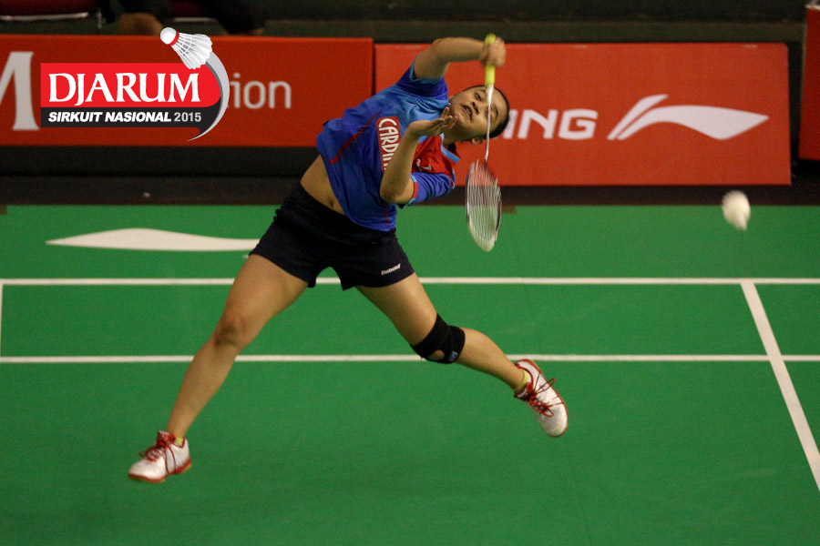Hera Desiana (Mutiara Cardinal) mengembalikan shuttlecock ke arah Jauza Fadhila (Pelita Bakrie).