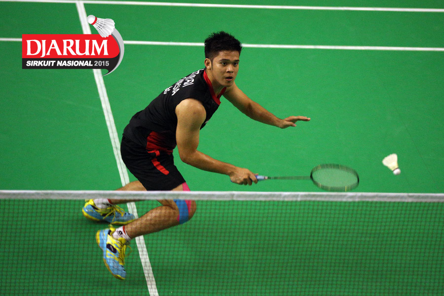 Fikri Ihsandi (Tangkas) mengembalikan shuttlecock ke arah Alamsyah Yunus (JR Enkei).