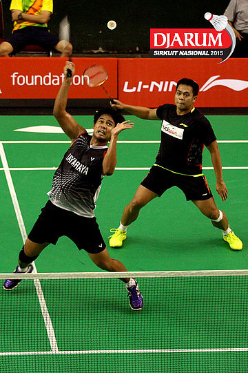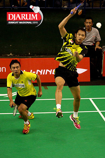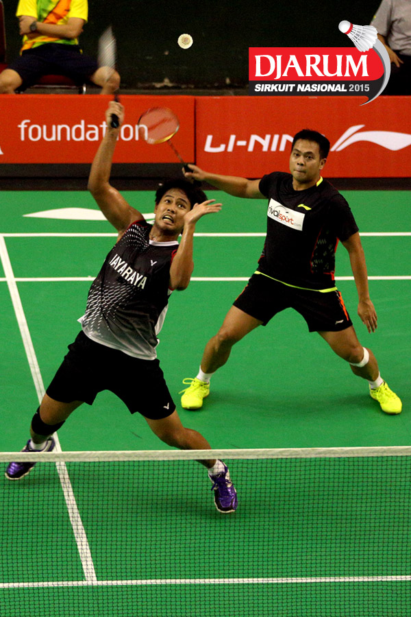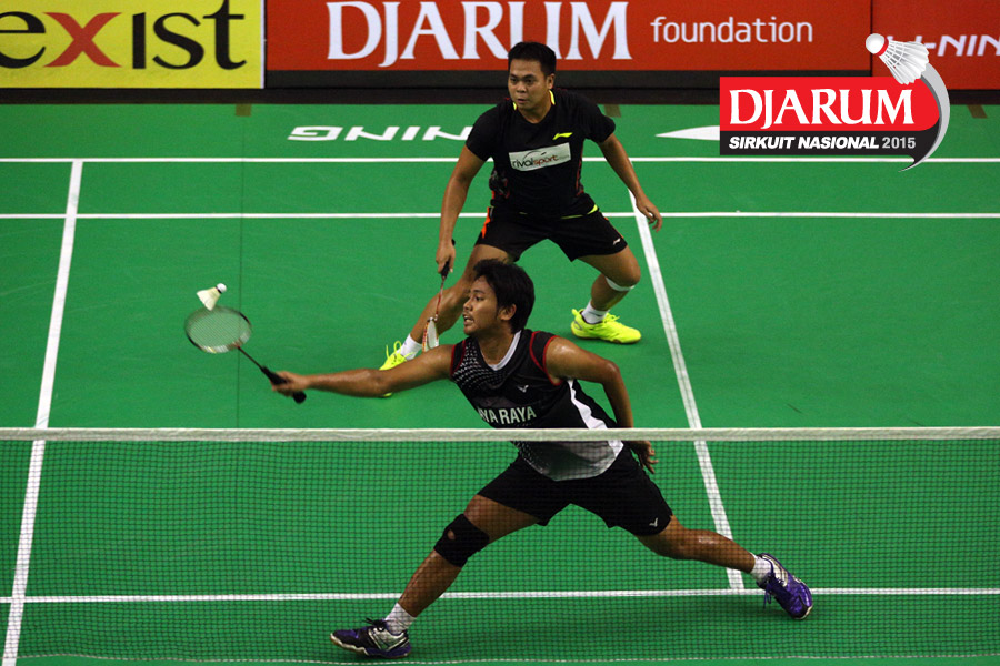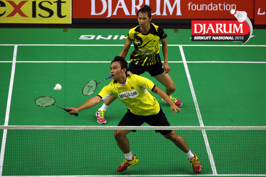 Fran Kurniawan/Trikususma Wardhana (Djarum Kudus/Suryanaga) mengembalikan shuttlecock ke arah Irfan Fadillah/Markis Kido (Jaya Raya).