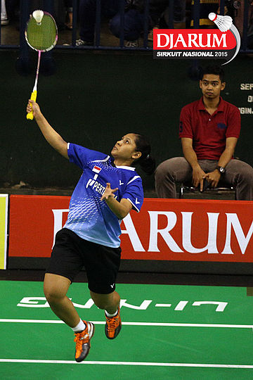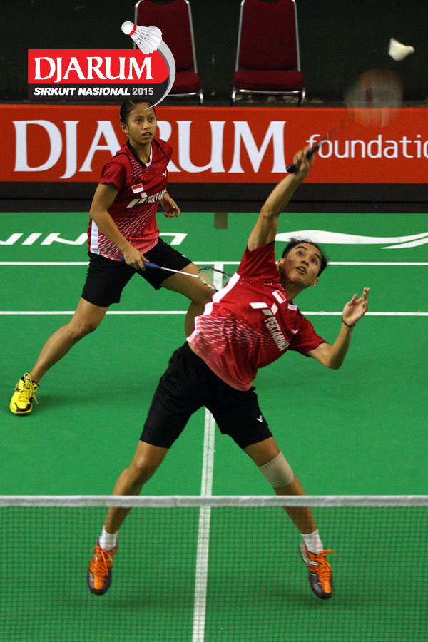 Dian Fitriani/Nadya Melati (Pertamina Fastron) mengembalikan shuttlecock ke arah Meirisa Cindy/Nisak Puji (Pelatnas).