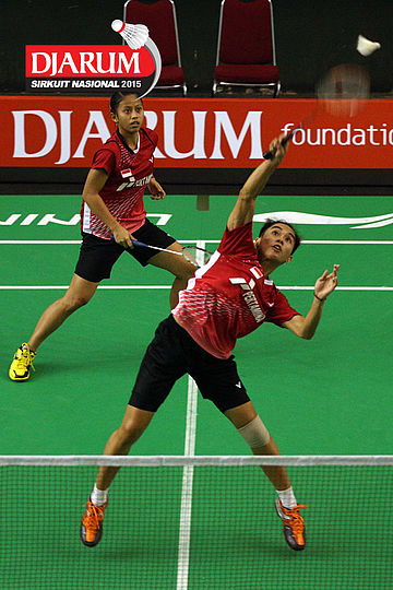 Fran Kurniawan/Trikususma Wardhana (Djarum Kudus/Suryanaga) menyambar pengembalian dari Irfan Fadillah/Markis Kido (Jaya Raya).