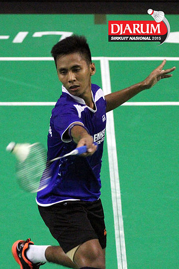 Alamsyah Yunus (JR Enkei) mengembalikan shuttlecock ke arah Setyaldi Putra (Guna Dharma).