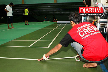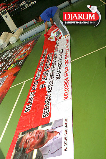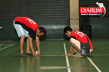 Seorang pekerja saat menuangkan cairan perekat untuk keperluan dekorasi pelaksanaan Djarum Sirkuit Nasional Li-Ning Jakarta Open 2014 di GOR Asia Afrika, Jakarta