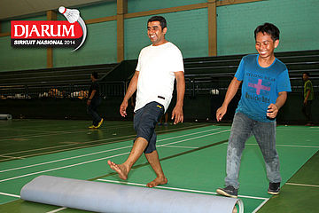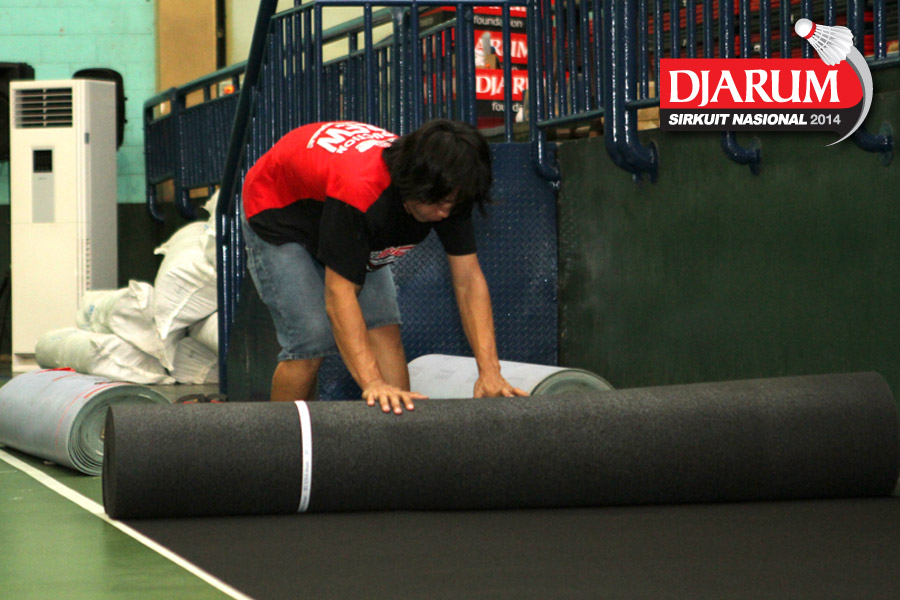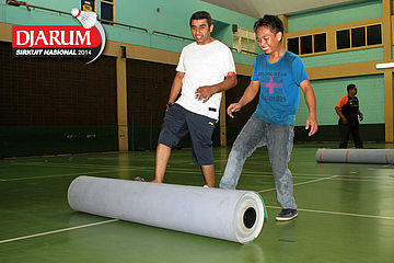 Dua pekerja saat membuka gulungan karpet pertandingan